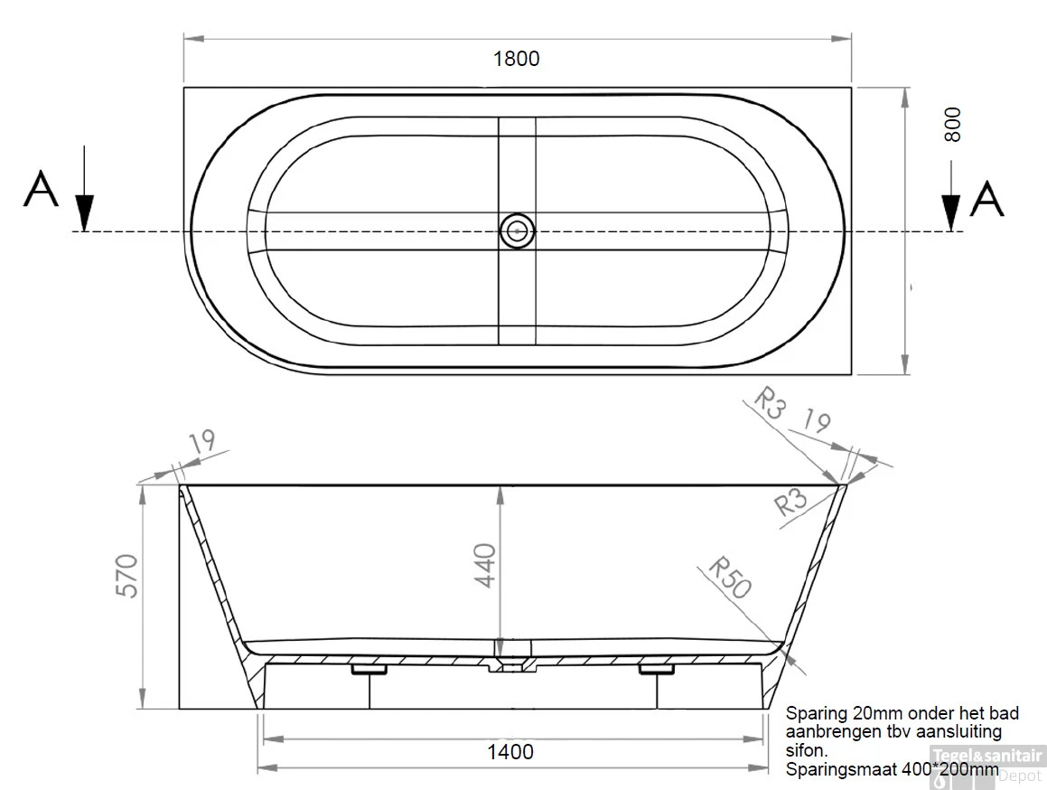 Het bad is voorzien van een overloop. Deze overloop is uniek vanwege zijn platte vorm.