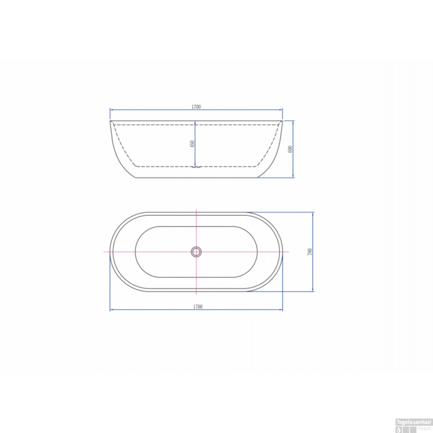 Aan de zijkant van het vrijstaande ligbad bevindt zich een kleine gleuf die dient als overloop. Deze overloop zorgt ervoor dat wanneer het bad te vol begint te lopen het water automatisch via deze gleuf de riolering in loopt. Het bad heeft een lengte van 170 cm, een breedte van 78 cm en een hoogte van 60 cm.